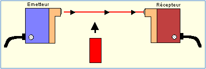 lumineux. Les détecteurs photoélectriques se composent essentiellement d'un émetteur de lumière associé à un récepteur photosensible. La détection est effective quand l'objet pénètre dans le faisceau lumineux et modifie suffisamment la quantité de lumière reçue par le récepteur pour provoquer un changement d'état de la sortie. Elle est réalisée selon deux procédés :